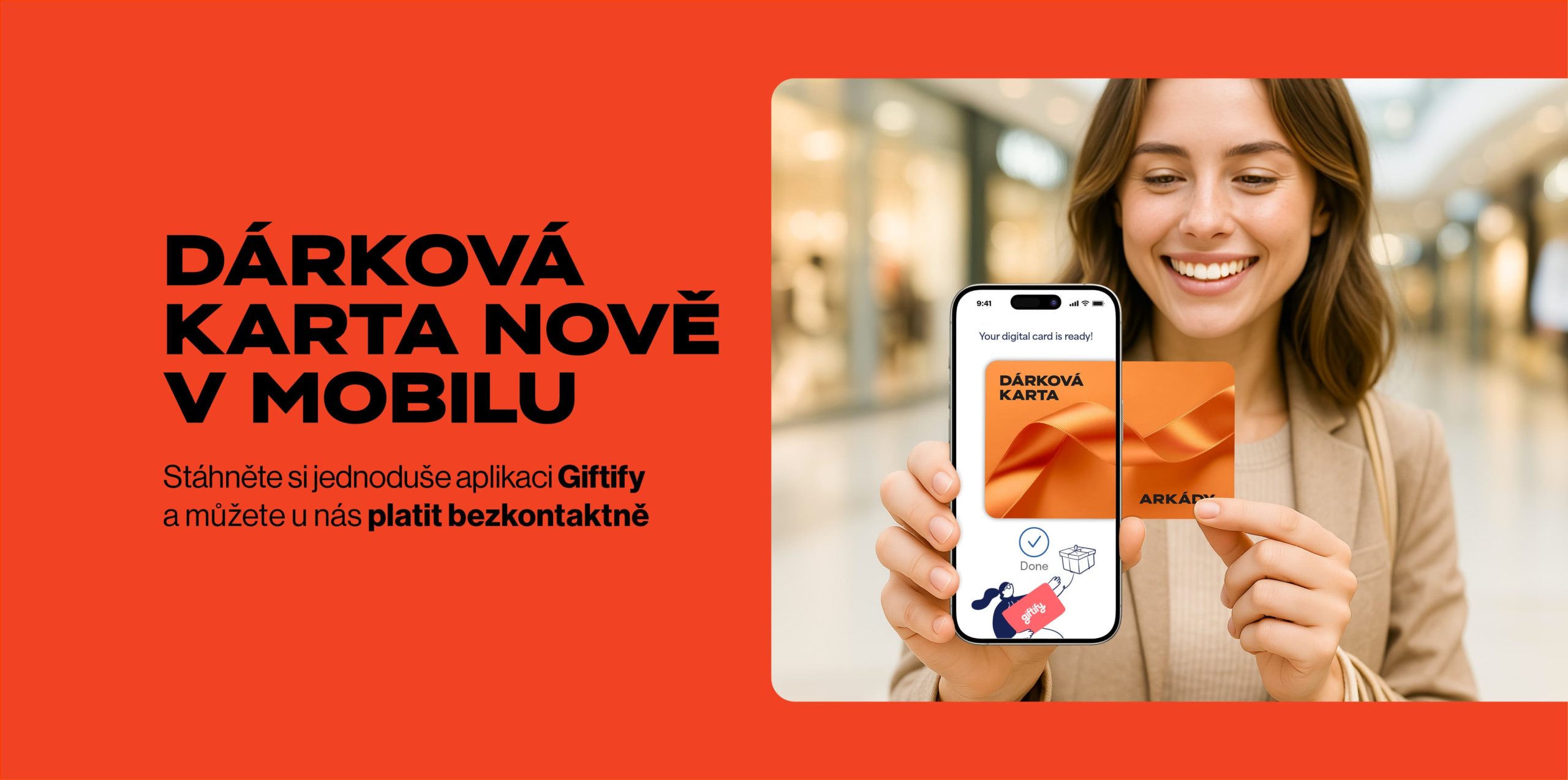 S dárkovou kartou v mobilu zaplatíte na Arkádách ve všech obchodech a restauracích, kde přijímají naše klasické dárkové karty.