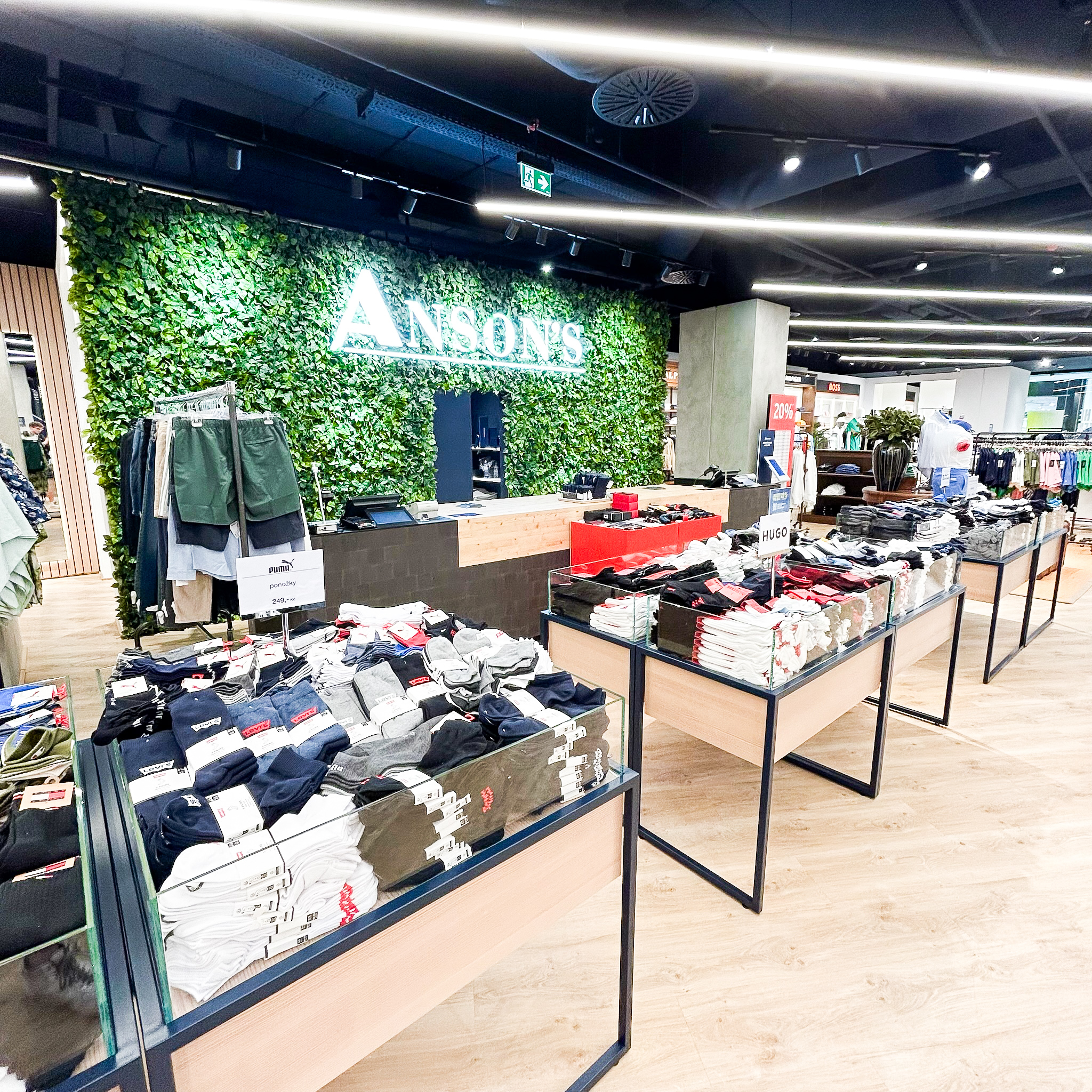V Anson’s najdete pánskou módu známých světových značek jako BOSS Black, HUGO, Tommy Hilfiger, GUESS, Tommy Jeans, Polo Ralph Lauren, Calvin Klein Jeans, ale i exkluzivní brandy Anson’s: McNeal, Christian Berg, Jake*s, REVIEW, či Christian Berg, včetně oddělení sportovní módy a obuvi. Od nesmrtelné klasiky po aktuální trendy, vše pod jednou střechou na více než 1200m2