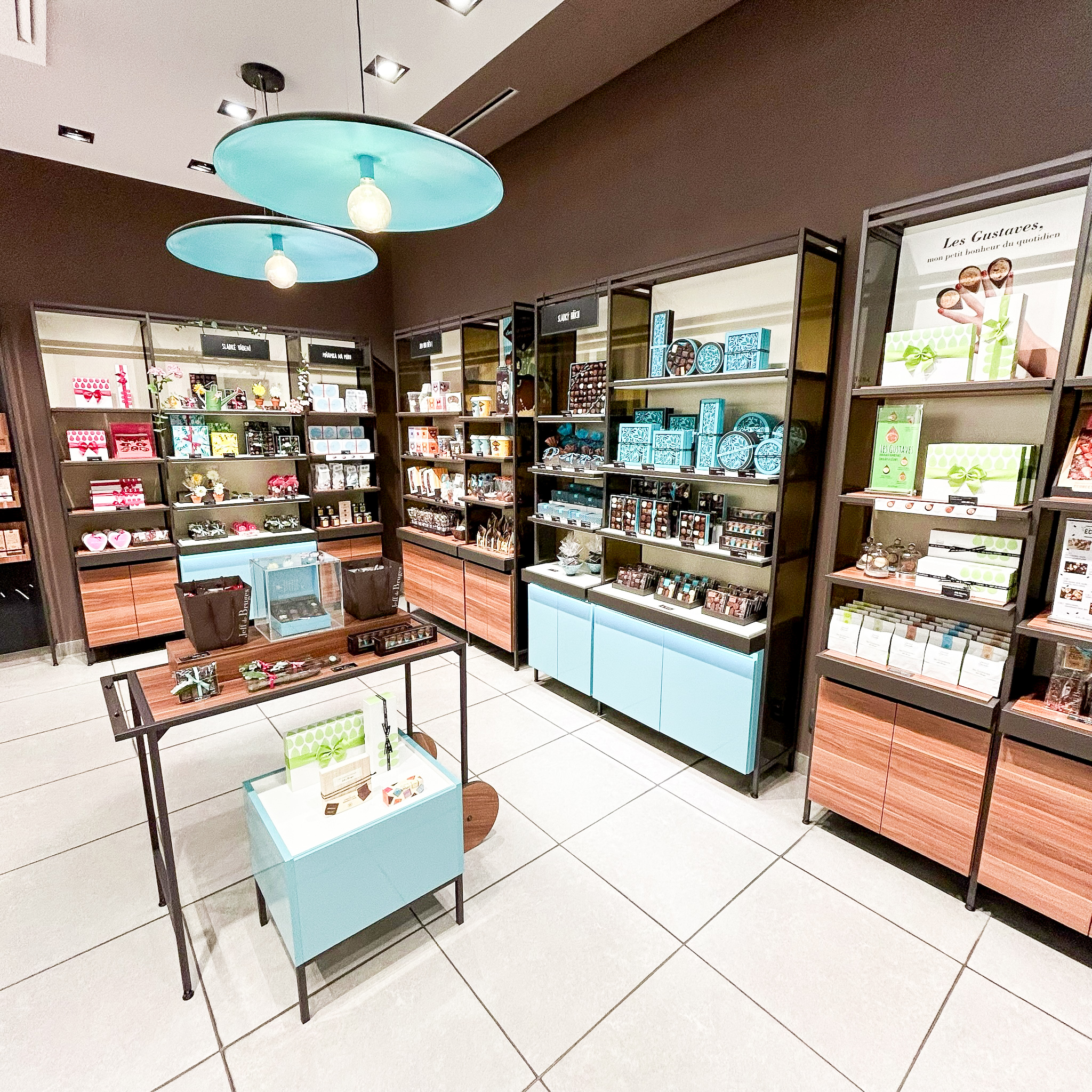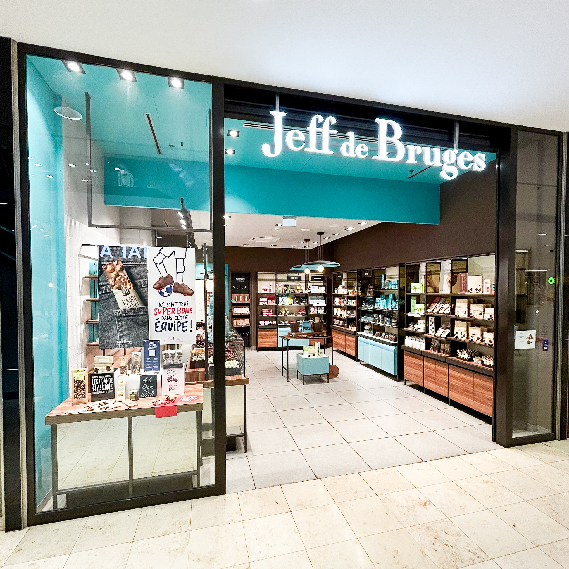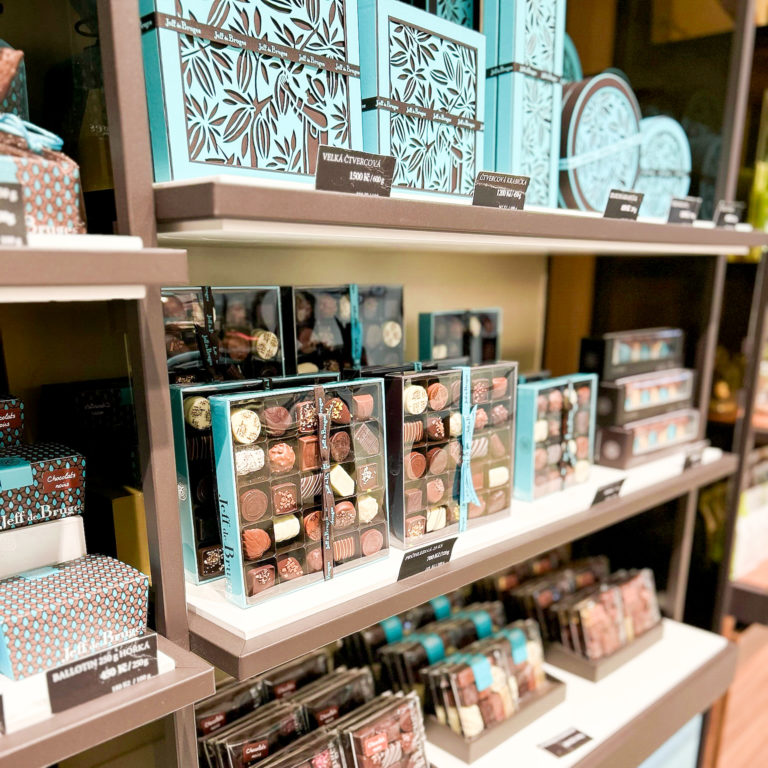 Obchod Jeff de Bruges nabízí výbornou francouzskou čokoládu , vyráběnou v továrně Neuhaus v Belgii dle francouzských receptur.